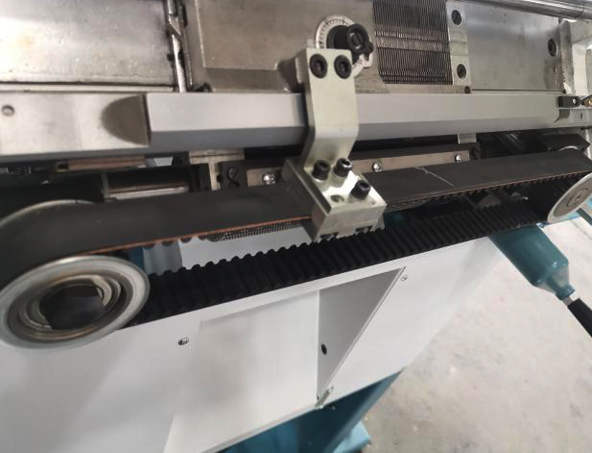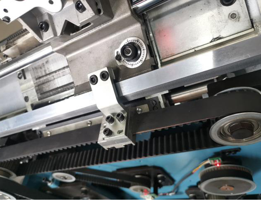 前后機頭由兩根同步帶單獨控制,并且前后同步帶輪與伺服電機同軸轉動,受力更均勻,使快速移動的機頭平穩運行。